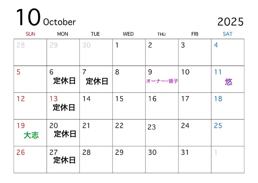 10月の定休日とスタッフのお休みのお知らせです☆